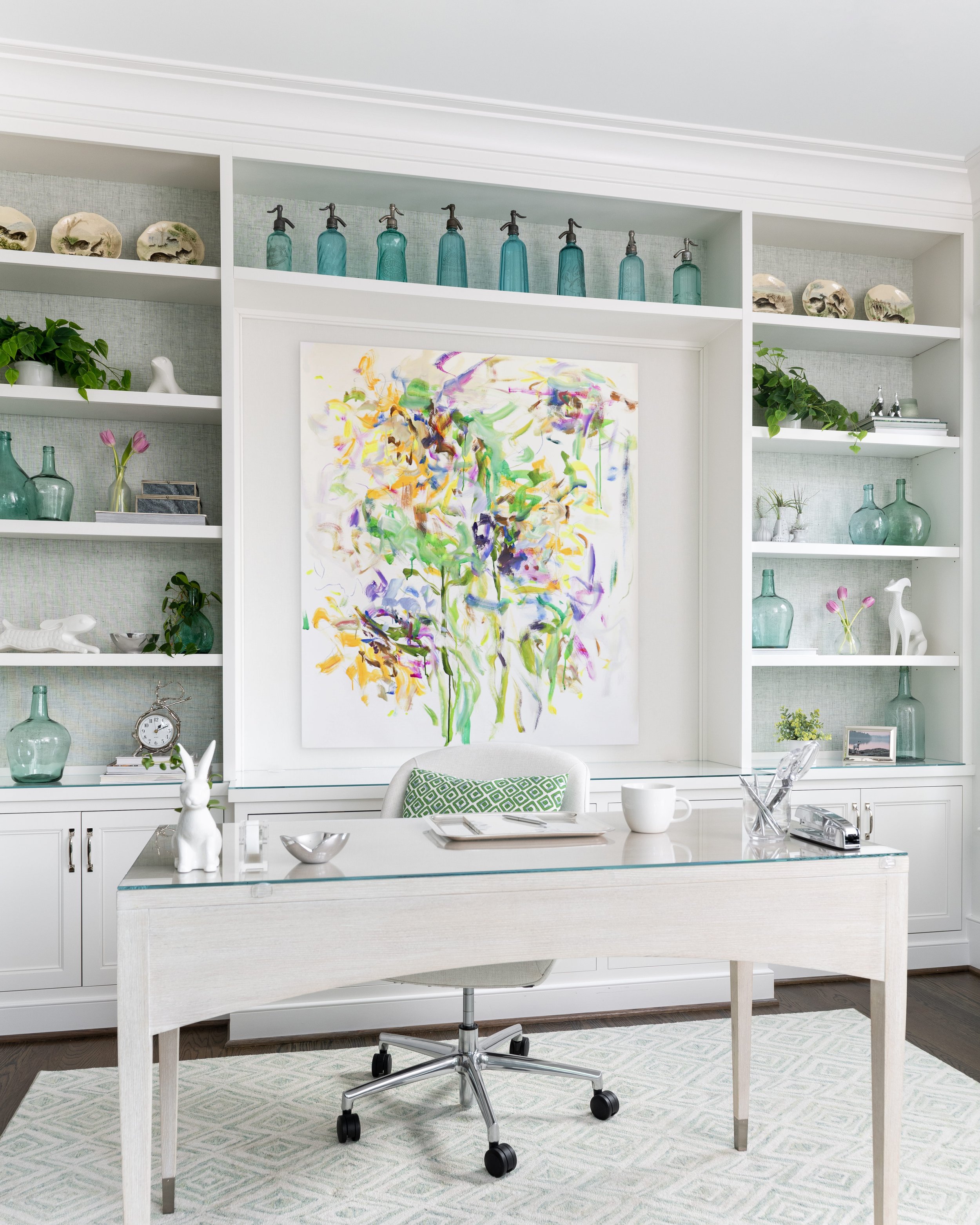 Light-filled and airy, the space features custom built-ins that display prized collections and art while providing concealed storage for everyday office essentials. A reading nook for the kids includes swivel chairs, flexible nesting tables for crafts, and ottomans that can be pulled out for extra guests. The result demonstrates how thoughtful residential interior design can balance beauty and utility seamlessly.