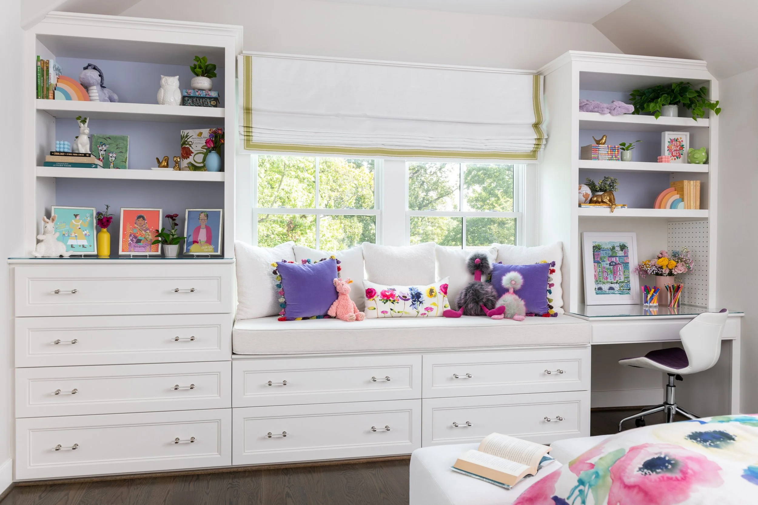 Bespoke upholstered seating in durable performance fabrics provides spaces for reading and creative activities. In one room, vibrant wallpaper transforms the shelving into a cheerful architectural backdrop; in the other, a built-in bench framed by cabinetry creates a natural lounge for reading, studying, and hosting friends.